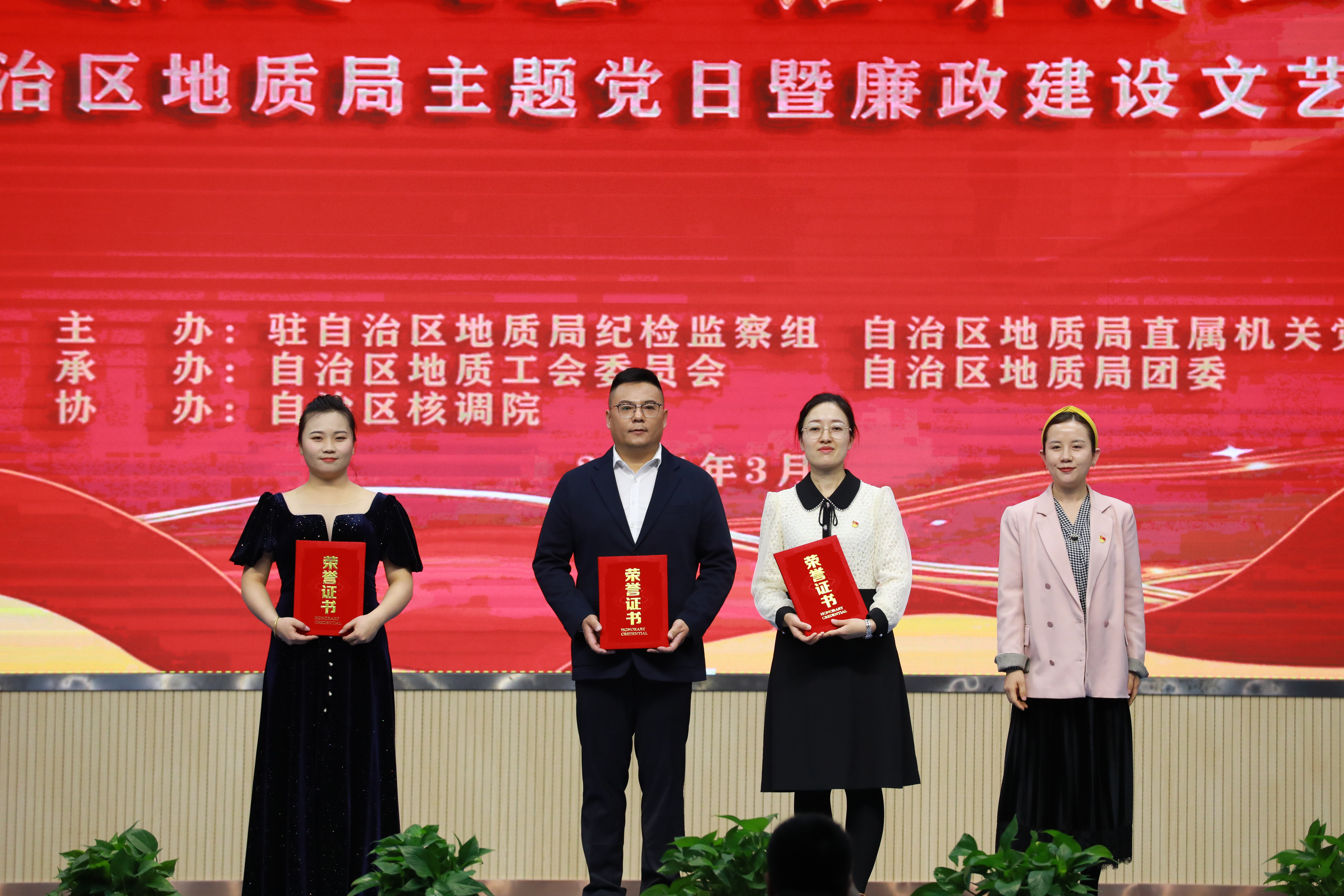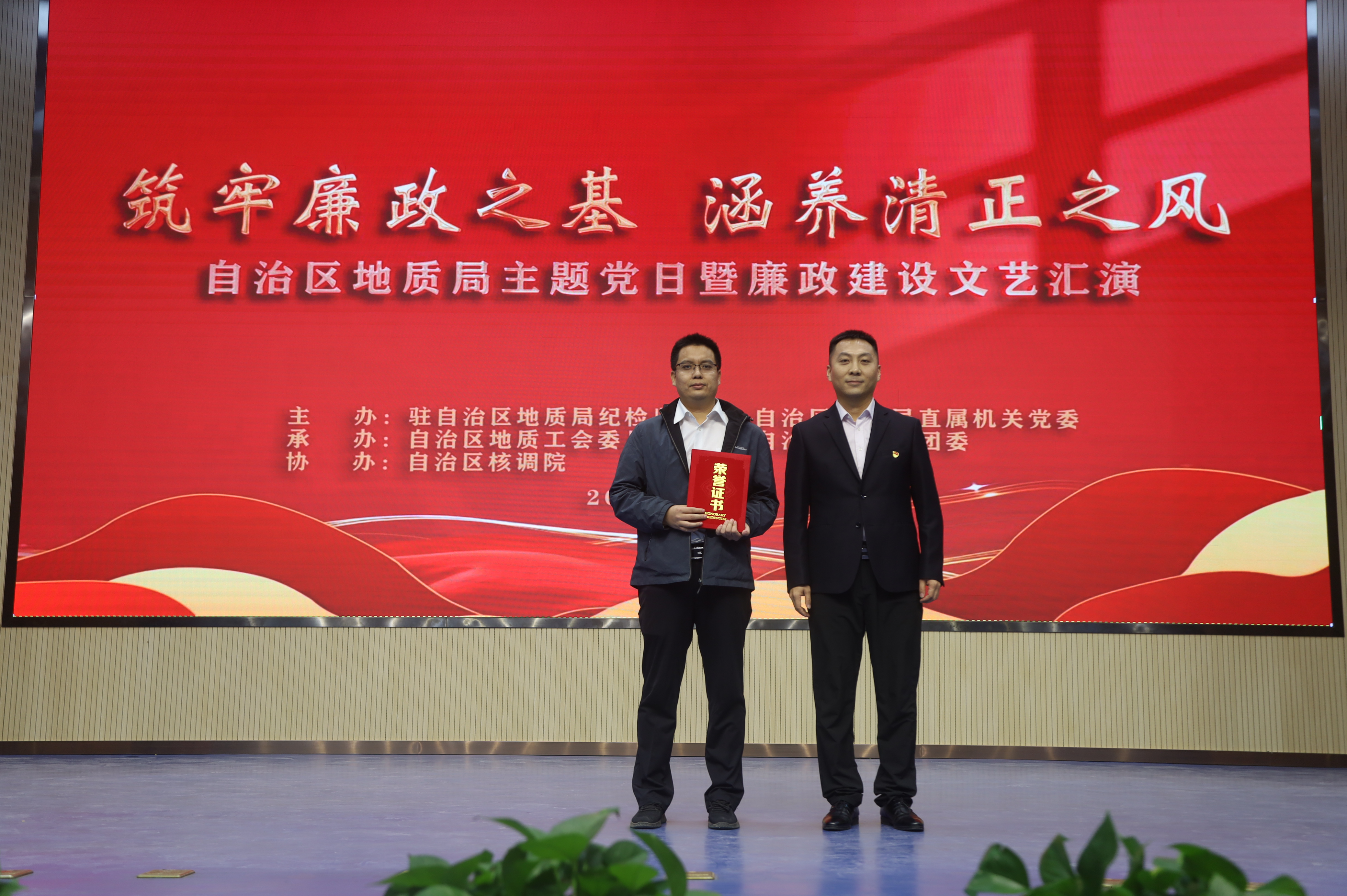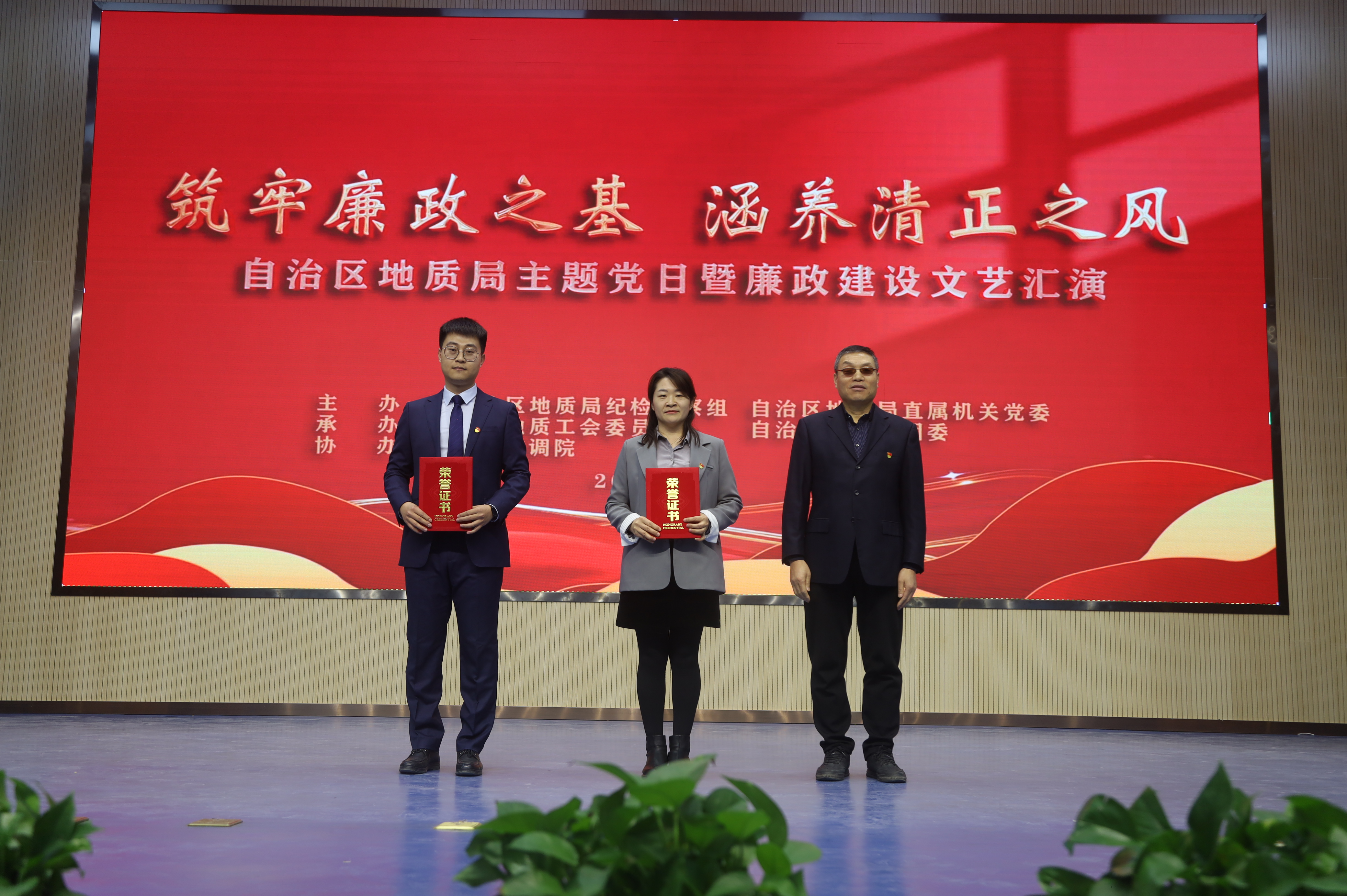 水环院情景剧《忏悔》获得一等奖,局机关影子剧《党旗飘扬的方向》和物化院情景剧《信仰之光》获得二等奖,煤炭地质局情景剧+书法《莫伸手》、遥感院情景剧《决堤》和地质博物馆独唱《明白人 清白人》获得三等奖,核调院荣获优秀组织奖。全局先进模范代表为获奖单位颁发了荣誉证书。