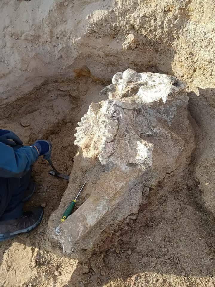 化石发现于吴忠市一处废弃矿坑,经团队系统挖掘,出土了包括上颌骨、臼齿及部分门齿在内的多个部位。化石整体形态清晰,上颌长110厘米、宽60厘米、高40厘米,臼齿保存完好,右门齿残留约40厘米。这一发现不仅是宁夏近十年来首次发现较完整的大型哺乳动物化石,也对研究中新世时期宁夏地区的古气候、古生态环境具有重要科学价值。