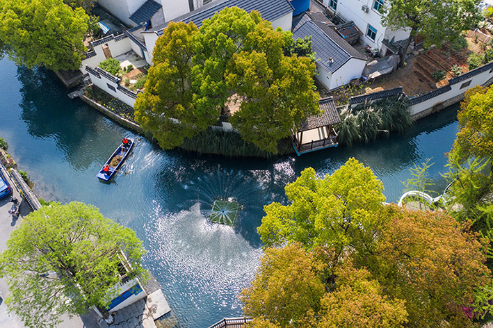 浙江省长兴县龙山街道渚山村,保洁人员进行日常河道护理巡查(4月9日摄,无人机照片)。新华社记者 徐昱 摄