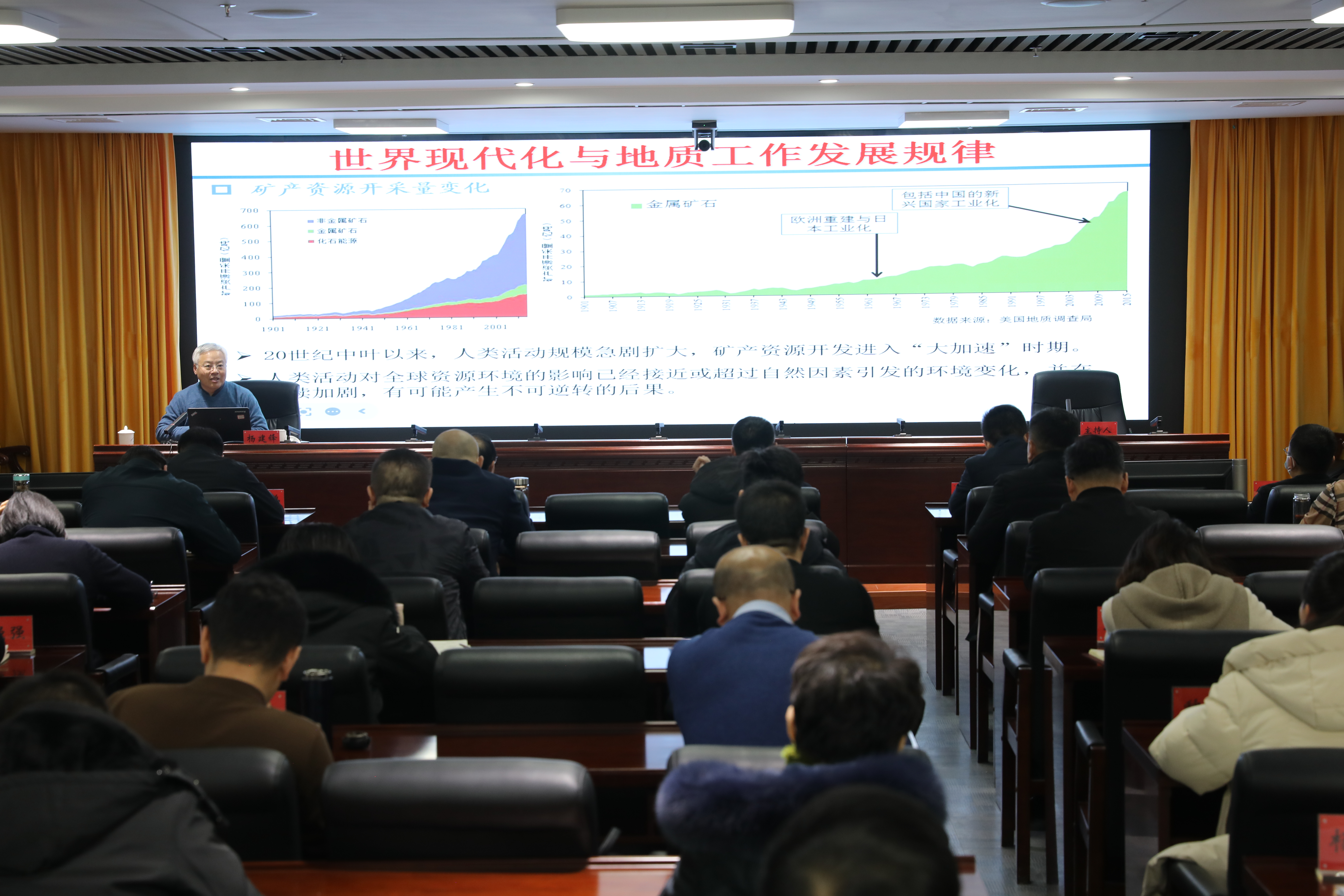 近日,地质局举办2026年第一期“宁夏地质大讲堂”,邀请中国地质调查局发展研究中心规划研究室杨建锋主任专题授课,局属各单位班子成员、局机关相关工作人员参加。