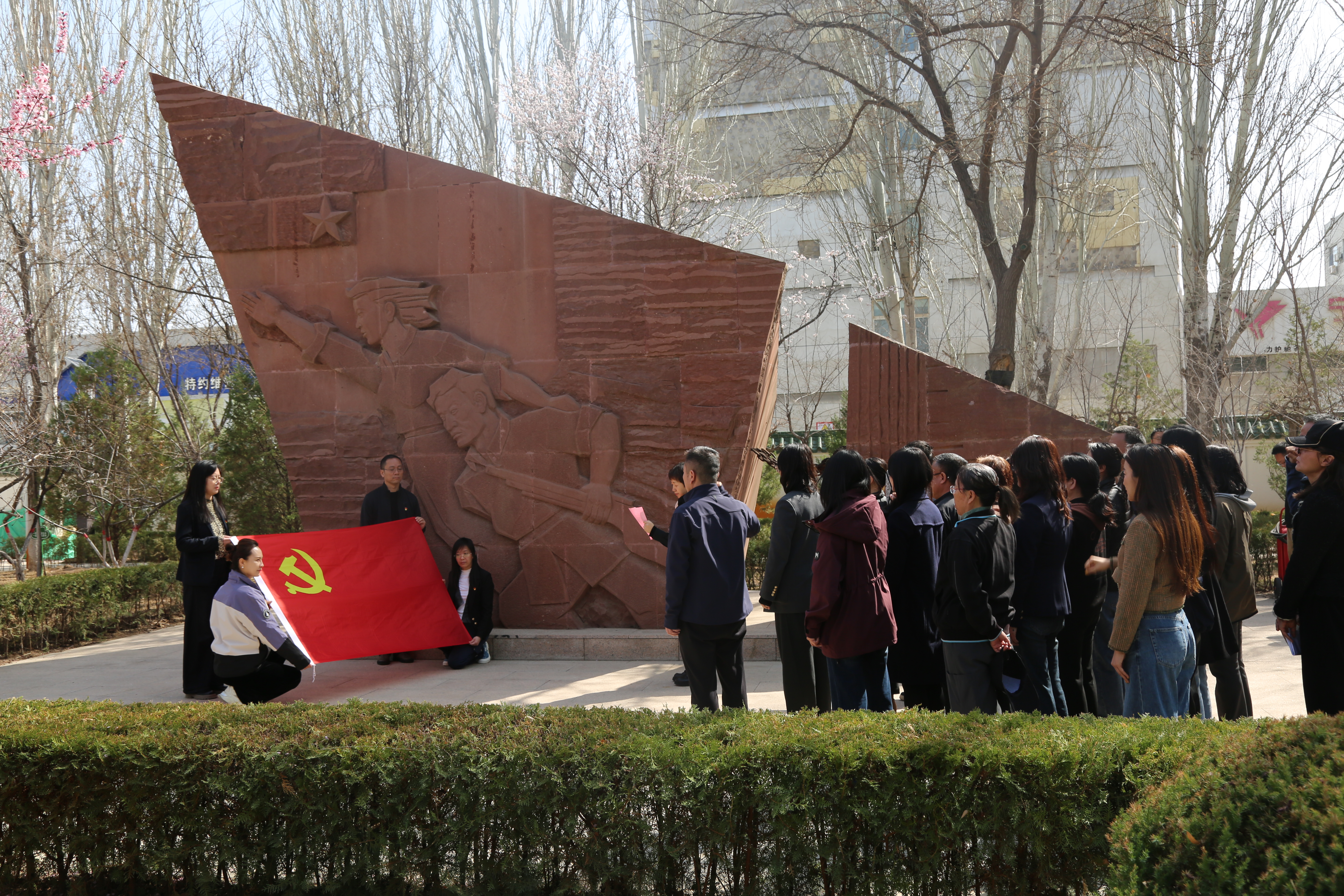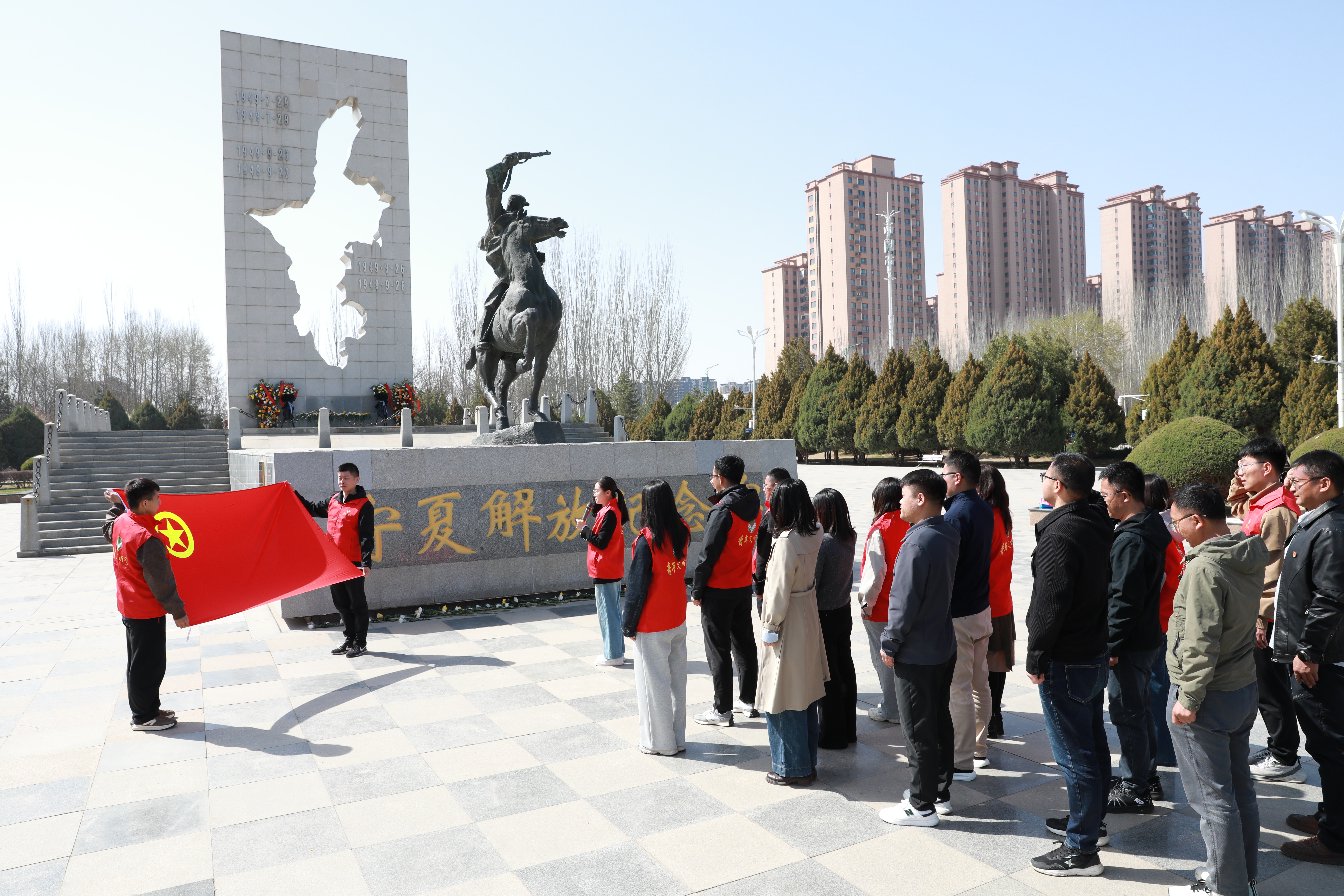 地调院、水环院组织青年职工前往宁夏解放纪念碑,开展“清明祭英烈”主题实践活动,认真聆听革命先辈为宁夏解放抛头颅、洒热血的英雄事迹,全体青年重温入团誓词,敬献鲜花、鞠躬致礼,缅怀先烈、致敬英雄。