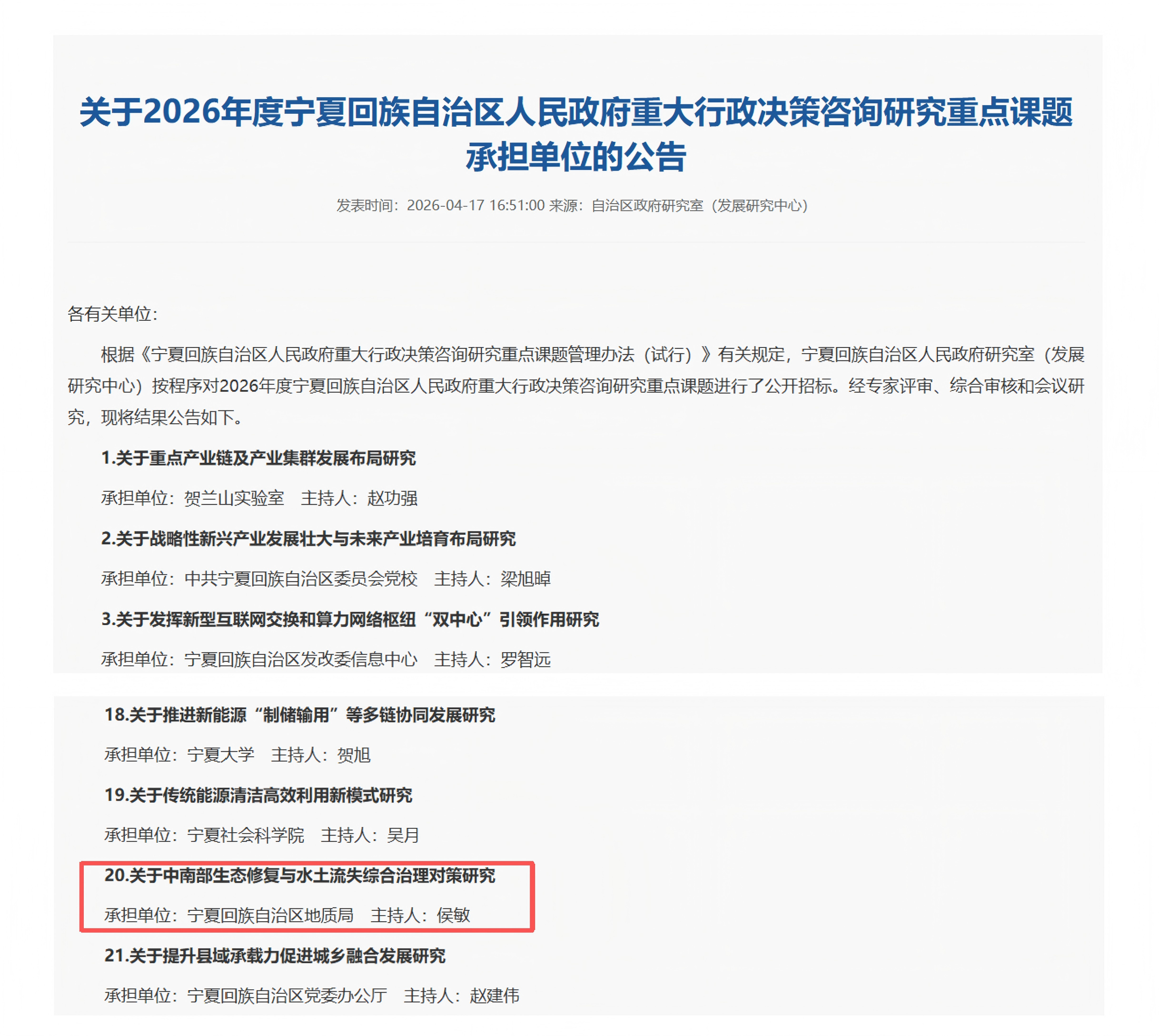 近日,宁夏回族自治区政府研究室(发展研究中心)正式发布《2026年度宁夏回族自治区人民政府重大行政决策咨询研究重点课题承担单位的公告》,地质局申报的“关于中南部生态修复与水土流失综合治理对策研究”课题成功获批立项。