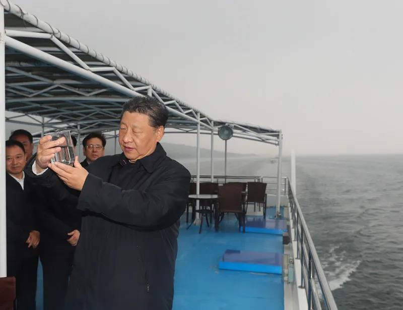 5月14日上午,中共中央总书记、国家主席、中央军委主席习近平在河南省南阳市主持召开推进南水北调后续工程高质量发展座谈会并发表重要讲话。这是座谈会前,习近平于13日在南阳市淅川县乘船考察丹江口水库时,察看现场取水水样。新华社记者 王晔 摄
