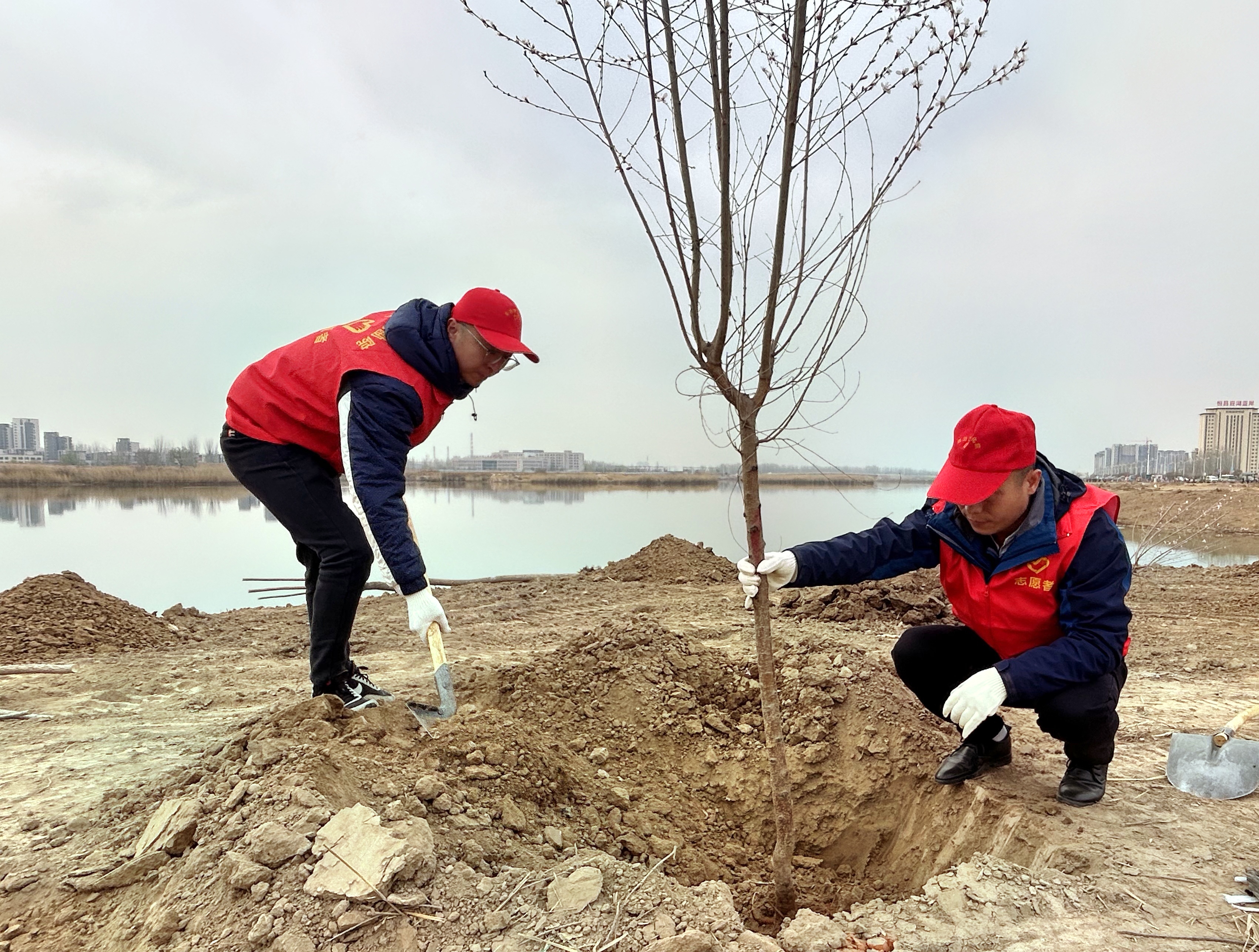 植树现场,大家分工协作、默契配合,挥锹挖坑、扶苗正根、培土压实、浇水定根,一派热火朝天的劳动景象。新栽苗木错落挺立,为春日大地增添一抹盎然绿意与蓬勃生机,勾勒出“志愿红”与“生态绿”交相辉映的动人画卷。